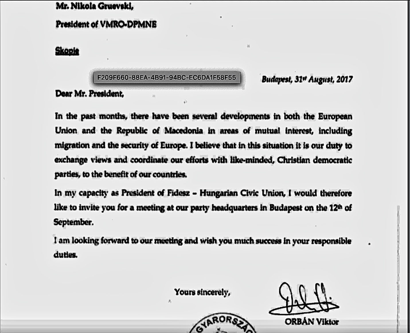 Kiperelte és kézhez is kapta Demeter Márta LMP-s politikus azt a meghívó levelet, amelyről korábban már lehetett hallani, de amelynek tényleges létezéséről eddig nem volt bizonyíték: immár olvasható Orbán Viktor 2017 augusztus 31-i keltezésű levele, amelynek címzettje Nikola Gruevszki köztörvényes bűnökért elítélt volt macedón miniszterelnök, s amelynek a „műfaja” meghívó levél. Csavar a dologban: Orbán a FIDESZ elnökeként hívta meg Gruevszkit (aki ellen már folyt az eljárás), a levél azonban így is miniszterelnöki fejlécű papíron született, s miniszterelnöki pecséttel van ellátva. Orbán politikai keresztapát játszik – állítja Demeter.