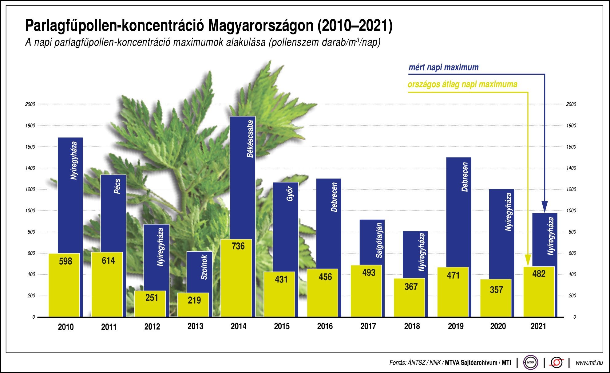 Az NNK irányítása alá tartozó, 20 állomásból álló Aerobiológiai Hálózat pollenmonitorozási adatai alapján egyelőre még csak pár parlagfű pollenszem jelent meg a levegőmintákban. Idén a parlagfű tömeges pollenszórása várhatóan augusztus első napjaiban veszi kezdetét, ekkor már országszerte tüneteket okozhat virágpora. A szezon erősségét nagyban befolyásolja az augusztus és szeptember időjárása. A pollenterhelést a tartós, esős időszakok átmenetileg visszavethetik, de a záporok, zivatarok csak rövid időre tisztítják meg a levegőt. A szezon tetőzése az előző évek tapasztalatai alapján, augusztus végén, szeptember elején várható – ismertette a központ.