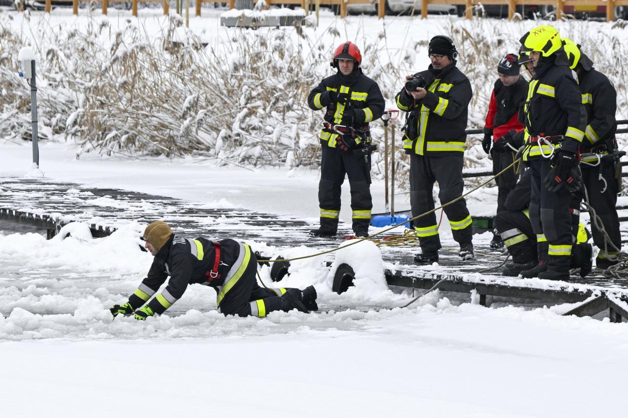 A jégen tartózkodás veszélyeire hívta fel a figyelmet a Fővárosi Katasztrófavédelmi Igazgatóság szerdán a XVI. kerületi Naplás-tavon tartott jégről mentési bemutatón.