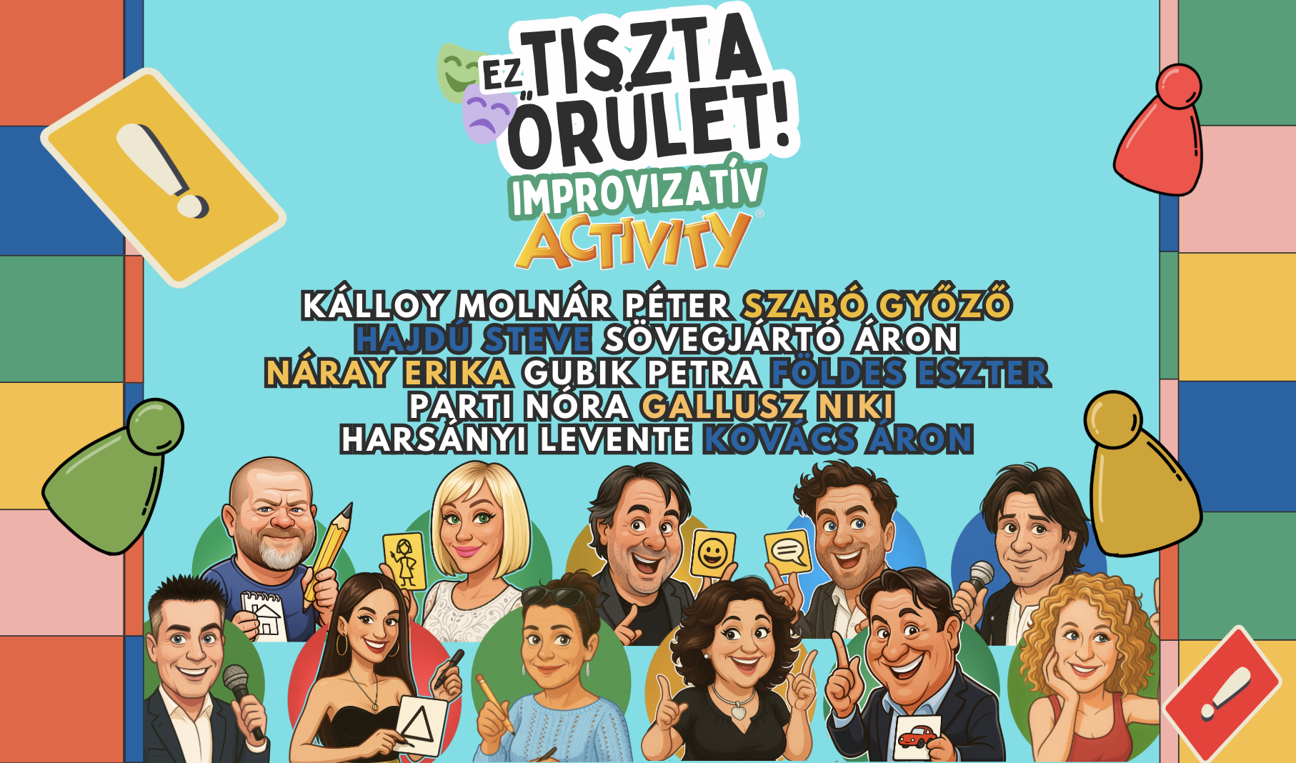 A szereplőgárda igazi sztárparádé: Kálloy Molnár Péter, Szabó Győző, Hajdú Steve, Sövegjártó Áron, Náray Erika, Gubik Petra, Földes Eszter, Parti Nóra és Gallusz Niki váltják egymást az előadásokban. Az ország legkedveltebb színészei most nem karaktereket formálnak, hanem saját személyiségükkel, humorukkal és kreativitásukkal hódítanak – a közönség pedig minden este részese lehet ennek a fergeteges, egyszeri és megismételhetetlen élménynek. Az előadás otthona Budapesten a 6SZÍN, de a produkció országos turnéra is indul, így vidéki helyszíneken is átélhető lesz ez a minden ízében újszerű, színházat és játékot ötvöző est.