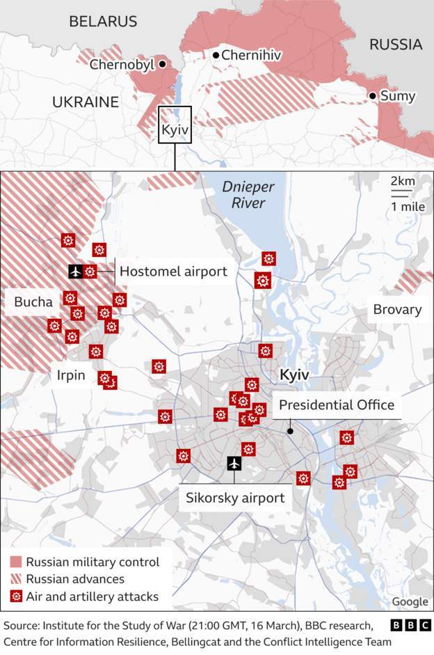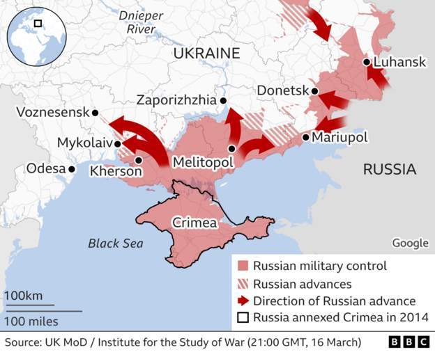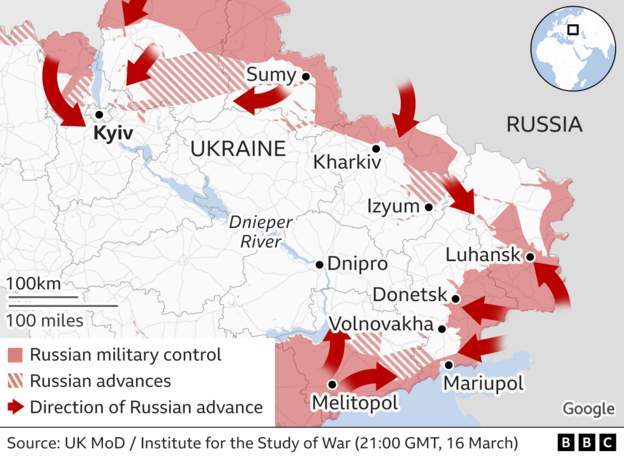Az utóbbi napokban szinte minden fronton lelassult az oroszok előrenyomulása. Továbbra sem tudták bekeríteni Kijevet. A várostól északra szinte folyamatos harcok dúlnak, de Kijevtől délre még hatalmas területek állnak az ukránok ellenőrzése alatt. A Krím félszigetről keleti és nyugati irányába indított támadások is elakadtak. Keleten Mariupol, nyugaton pedig Mikolajiv állja útját a támadóknak. Ugyanakkor a kelet felől támadó orosz csapatok is megtorpantak, bár kezdetben viszonylagos sikereket értek el a Luhanszki és a Donyecki régióban. E két területen korábban is harcok voltak az ukrán kormányerők és az oroszbarát szakadárok között. Az észak-keleti irányból indított orosz offenzíva is megállt, mert a támadók még mindig nem tudták elfoglalni Szumit. Bár már szinte teljesen körülvették és folyamatosan lövik várost.