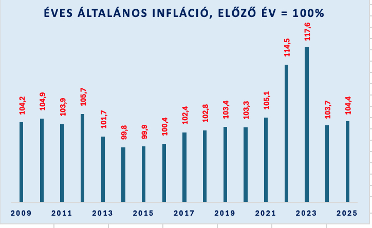 Íme az általános infláció alakulása 2009 és 2025 között. Mint láthatják Bajnai alatt 4,2, most 4,4 százalék volt.