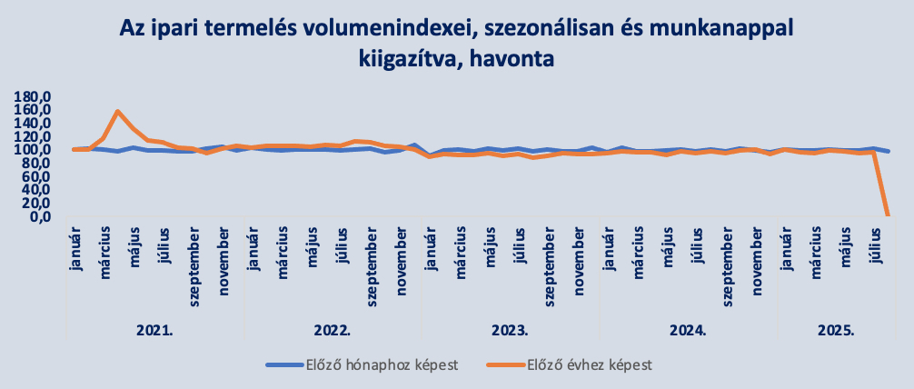 A Központi Statisztikai Hivatal a héten tette közzé a fenti adatot, illetve annak néhány további előzetes részletét. Mint a gyorstájékoztatóban olvasható: augusztusban az ipari termelés volumene 7,3, munkanaphatástól megtisztítva 4,6 százalékkal maradt el az egy évvel korábbitól. A szezonálisan és munkanappal kiigazított adatok alapján az ipari kibocsátás 2,3 százalékkal volt kisebb a 2025. júliusinál.
