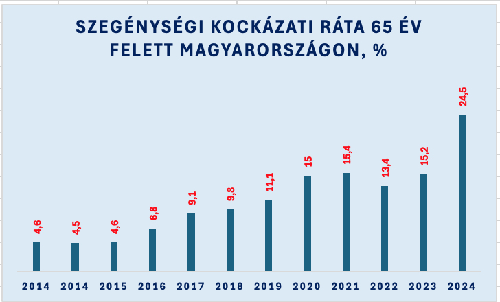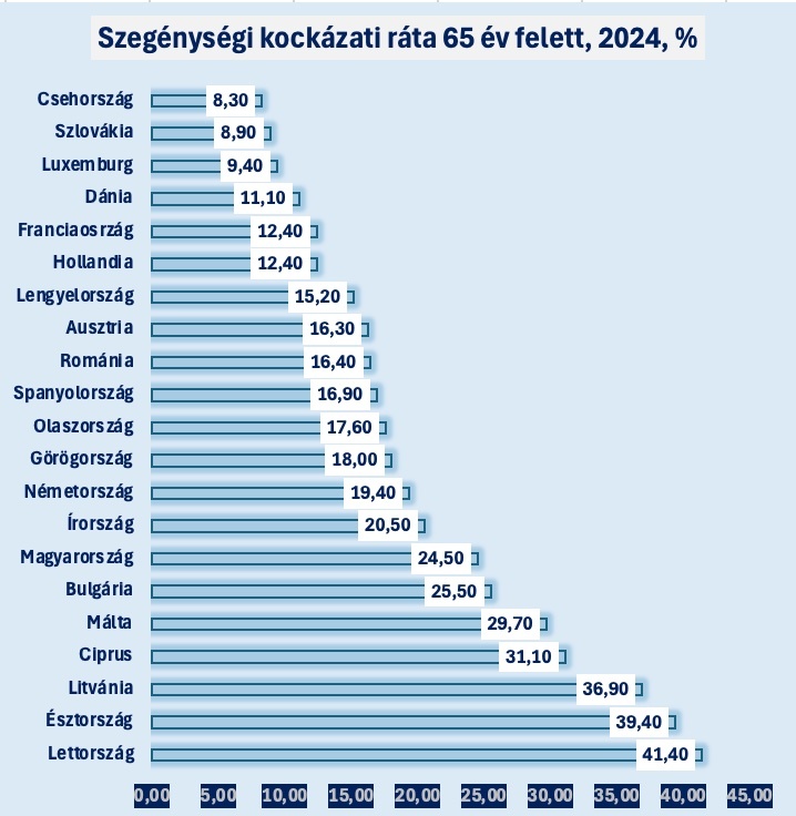 Az alábbi grafikon a szegénységi kockázati ráta segítségével mutatja be, hogyan élnek európai összehasonlításban a magyar idősek. (Ez egy olyan statisztikai mutató, amely azt méri, hogy egy adott országban hányan élnek a jövedelmi szegénységi küszöb alatt.) A grafikon a 2024. december 31.-i állapotot mutatja a 65 évnél idősebb korosztály esetében.