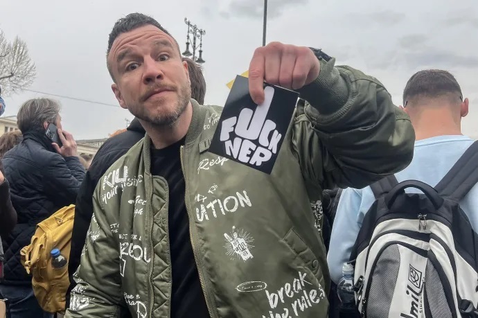 Molnár Áron „Fuck NER” matricákat osztogatott a tömegben