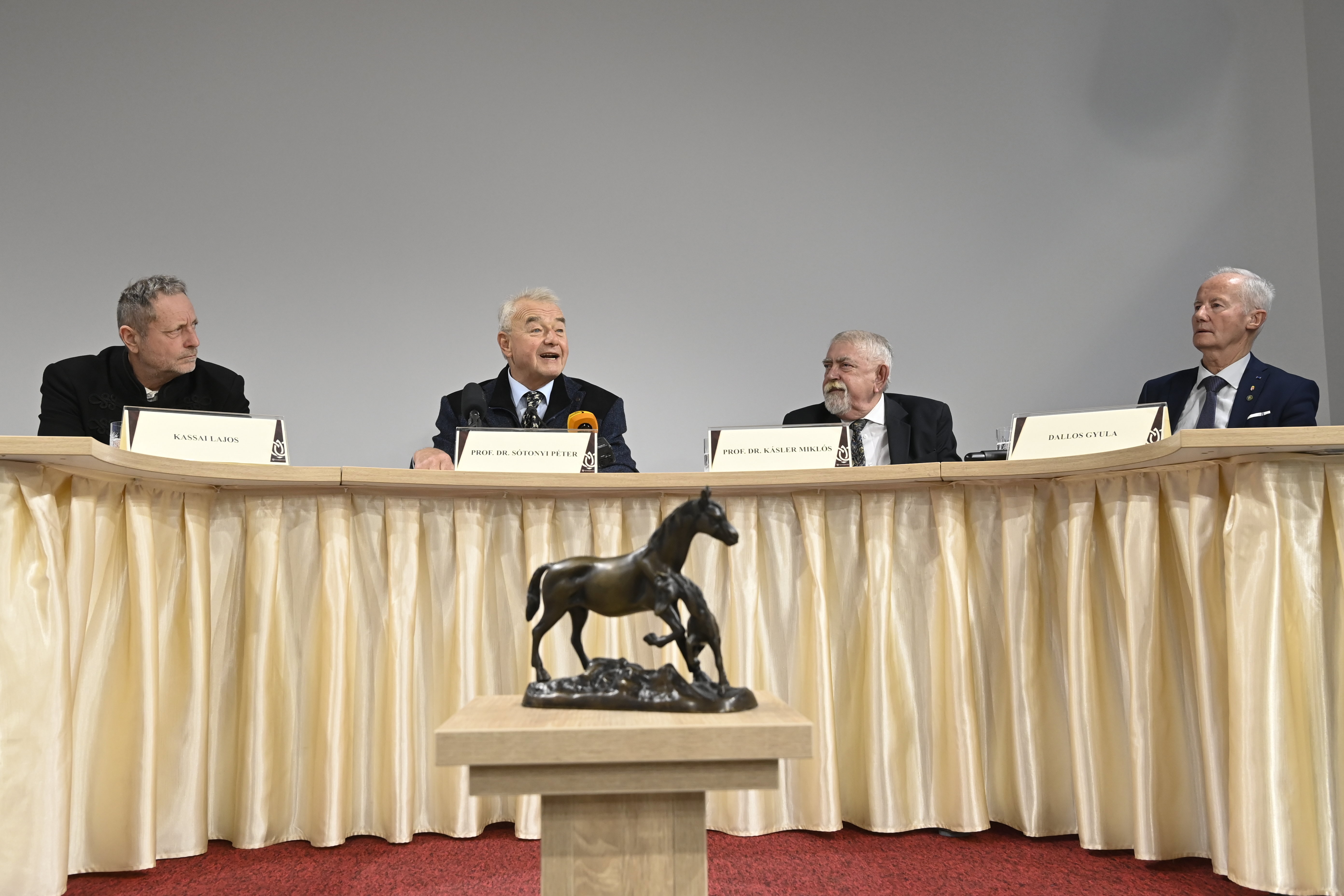 Kassai Lajos lovasíjász, Sótonyi Péter, az Állatorvostudományi Egyetem rektora, Kásler Miklós, a Magyarságkutató Intézet főigazgató és Dallos Gyula, a Honvédelmi Minisztérium Kincsem nemzeti lovas program megújításáért és végrehajtásáért felelős miniszteri biztosa a honfoglalás kori kunfakóhoz hasonló ló tenyésztéséről és kiképzéséről tartott sajtótájékoztatón 2024. február 26-án. Eördögh András tenyésztő, az Ősi Lófajtákat Tenyésztők Egyesületének elnöke 30 éves munkával honfoglalás kori jelleget hordozó lovat tenyésztett ki, amely hasonló az ősi kunfakó lovakhoz. MTI/Kovács Tamás