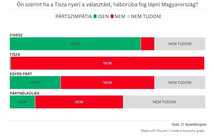 A megkérdezettek 54 százaléka nemmel felelt arra a kérdésre, hogy háború lépne-e az ország, amennyiben Magyar Péter venné át a kormányrudat – derült ki a 21 Kutatóközpont felméréséből, amelyet a 24.hu megbízásából készített. Csak a válaszadók 25 százaléka gondolta valódinak a háborús fenyegetést, 21 százalékuknak pedig nem volt véleménye, vagy nem akarták azt megosztani.