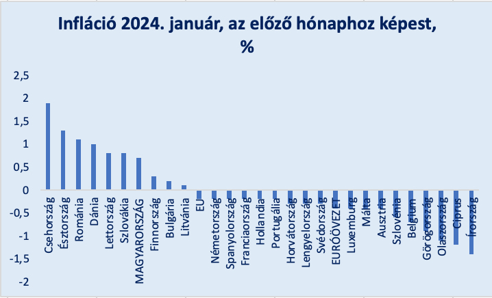 Csütörtökön tette közzé az Európai Unió statisztikai hivatala a januári inflációs adatot. Az Eurostat közleményében azt láthatjuk, hogy a drágulás üteme mind a 27 tagország átlagában, mind pedig az euróövezetben csökkent. A szórás sem olyan nagy, mint volt korábban: a 2023. januári fogyasztói áremelkedési rátához képest az idén januárban a legalacsonyabb Dániában volt (0,9 százalék), a legmagasabbat pedig Romániában mérték (7,3 százalék). Magyarország a korábbi hosszú hónapokhoz képest (durván egy évig negatív ranglista-vezetők voltunk) ezúttal jobb pozícióba került, a (harmonizált) 3,7 százalékos ráta hátulról a kilencedik helyet „érte”, azaz a középmezőny aljába keveredtünk.