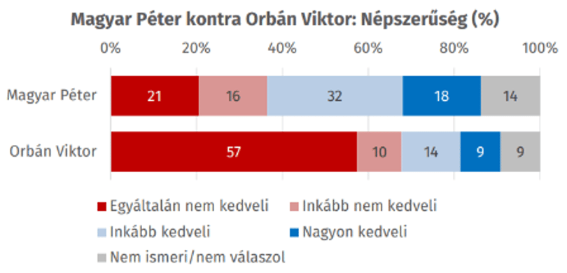 Feltűnő azonban, hogy Orbán Viktor elutasítottsága is rendkívül magas, a megkérdezettek 57 százaléka mondta, hogy egyáltalán nem kedveli, 10 százalékuk pedig azt, hogy inkább nem kedveli. Magyar Pétert 21 százalék nem kedveli egyáltalán és további 16 százalék állítja, hogy inkább nem kedveli.