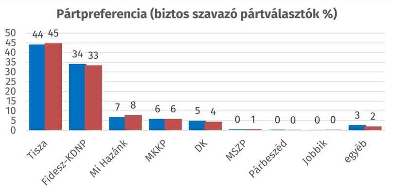 A reprezentatív felmérés 1000 fő telefonos megkérdezésével készült november 24. és 28. között. A pártválasztók körében a Tisza 43, a Fidesz 35 százalékon áll, e téren szintén nem történt változás, a különbség 8 százalékpont az előbbi javára. Az egyetlen szemmel látható, bár hibahatáron belüli változás a biztos szavazó pártválasztók körében történt: a Tisza itt 1 százalékpontot erősödött, 45 százalékra, a Fidesz-KDNP pedig 1 százalékponttal esett vissza, 33 százalékra. A különbség így 12 százalékpont a Tisza javára a biztos szavazók körében.