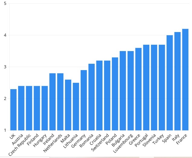 Olaszországban, Franciaországban és Spanyolországban valamivel enyhébb a teher, mindhárom országban 33 százalék alatt van, míg az Egyesült Királyságban az európai átlagnak megfelelő, 36 százalékos.