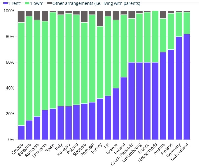 Az egyedül élők körében a lakástulajdonlási arány jelentősen alacsony Svájcban (17 százalék), Németországban (19 százalék) és Máltán (15 százalék).
