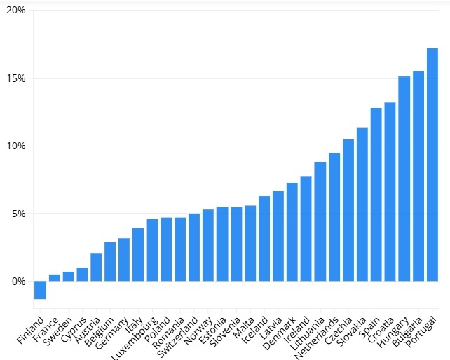 A legmeredekebb emelkedést Portugáliában (+17,2 százalék), Bulgáriában (+15,5 százalék) és Magyarországon (+15,1 százalék) regisztrálták.