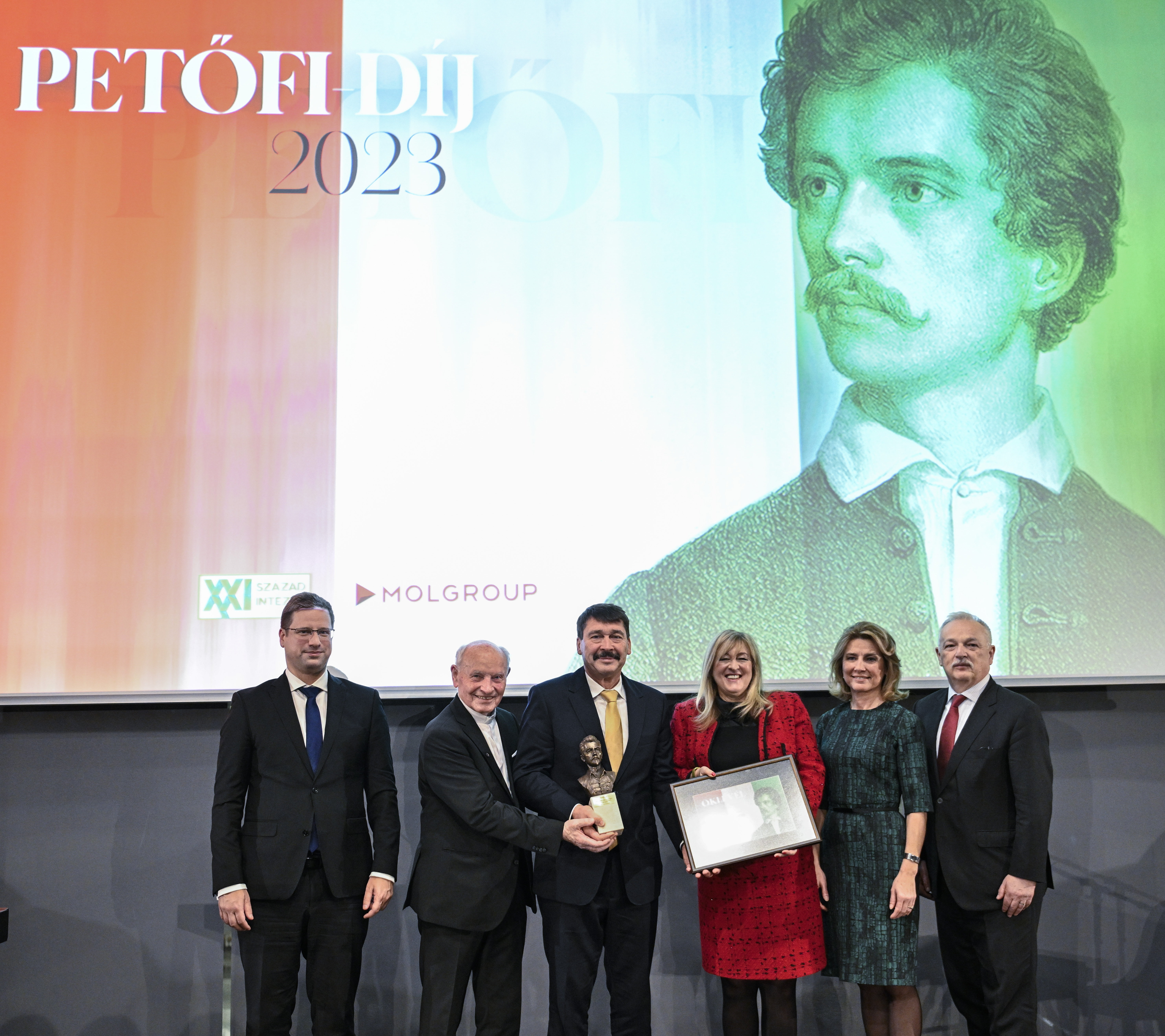 Gulyás Gergely Miniszterelnökséget vezető miniszter, Kozma Imre, a Magyar Máltai Szeretetszolgálat alapítója, Áder János volt köztársasági elnök, a díjazott, Schmidt Mária történész, a XXI. Század Intézet főigazgatója, Herczegh Anita, Áder János felesége és Hernádi Zsolt, a Mol-csoport elnök-vezérigazgatója a Petőfi-díj átadásán a MOL Campusban 2023. december 6-án. MTI/Szigetváry Zsolt