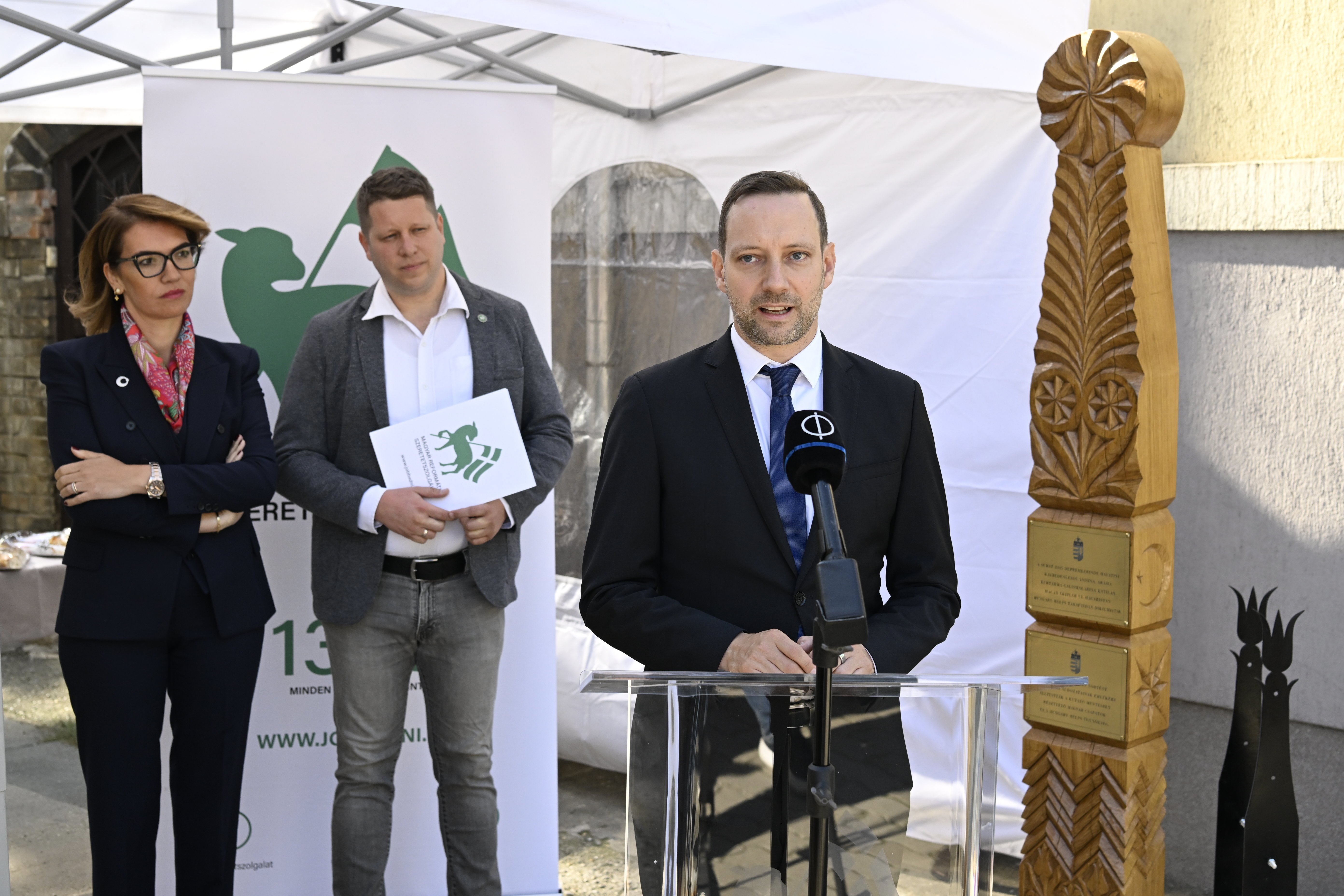 Azbej Tristan, a Külgazdasági és Külügyminisztérium üldözött keresztényeket segítő programokért felelős államtitkára beszél, mögötte Gülsen Karanis török nagykövet és Juhász Márton, a Magyar Református Szeretetszolgálat ügyvezető igazgatója a februári törökországi és szíriai földrengés áldozatainak, valamint a magyar kutató-mentőcsapatok szolgálatának emléket állító faragott emlékoszlop hivatalos átadásán a Magyar Református Szeretetszolgálat budapesti központjában 2023. szeptember 28-án. MTI/Kovács Tamás