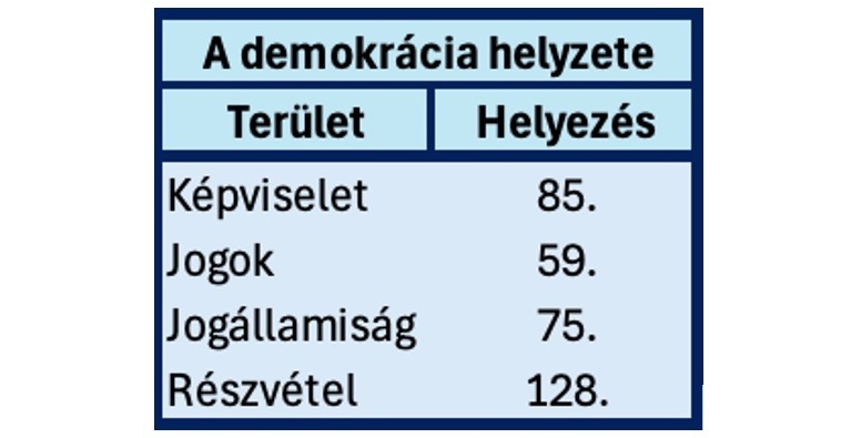 Magyarország teljesítménye – ahogy pestiesen mondják – „középrossz” a demokrácia általános helyzetén belül vizsgált négy kategória mindegyikében.