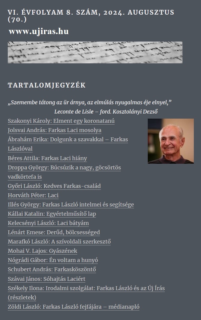 Farkas László szerkesztő úrra emlékezve. (Az Új Írás legfrissebb számában írók, költők, irodalmárok és munkatársai emlékeznek a nemrég elhunyt Farkas Lászlóra, ez a cikk is ezek közül van.)