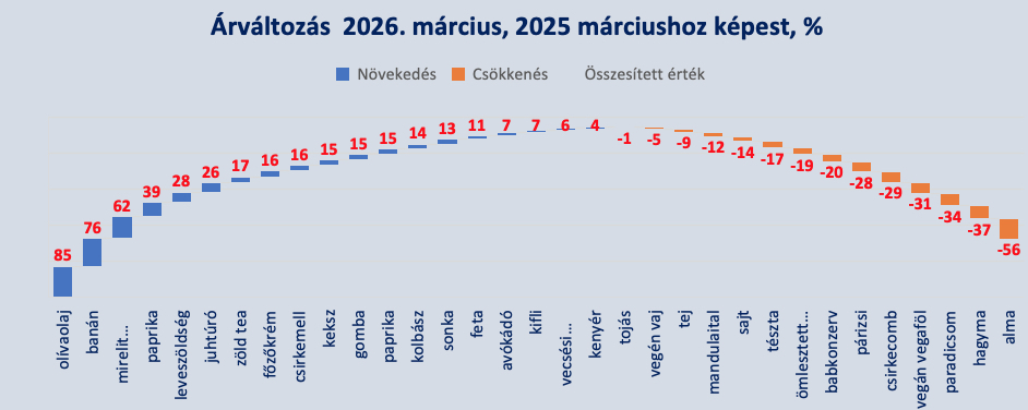 „A február még jó volt, de innen emelkedni fognak az élelmiszerárak” – ezzel a címmel jelentettük meg egy hónappal ezelőtt a saját – nem tudományos – módszerünk alapján számított élelmiszerinflációs helyzetképpel foglalkozó cikkünket. És az előrejelzésünk – sajnos – helytállónak bizonyult. Márciusban ugyanis megugrott az egy évvel korábbihoz viszonyított áremelkedési ütem, bár arra azért kevéssé számítottunk, hogy a februári 1,4 százalékos dinamika csaknem 3,5-szeresét éri majd el. Nem csak ez kirívó, hanem az árak alakulásának elképesztően széles skálája is. Volt itt minden, 85 százalékos drágulás az egyik végen, s mínusz 56 százalékos a másikon. Ami nem volt, az a szétterült, kiegyenlített árváltozás: a vizsgált 32 tétel között csak 8 olyan akadt, amelynek pluszban vagy mínuszban egyszámjegyűen változott az ára. A nemzetközi helyzet – Trump Irán ellen indított háborúja – máris alaposan odavágott az árak alakulására szerte a világon.
