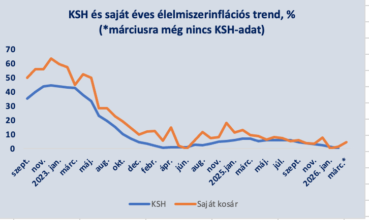 Mint a Hírklikk olvasói már megszokhatták, az élelmiszerárak három évvel ezelőtti elszabadulása óta hónapról hónapra mi is közzétesszük a saját virtuális bevásárlókosarunk árváltozását. Az élelmiszer-kosarunk tartalma az adatfelvétel módja miatt technikai okkal magyarázhatóan nem egyezik meg a megelőző havi kosaraink tartalmával: a cikk szerzője által kedvelt online élelmiszer „ábécé” felületén mód van visszanézni az egy évvel korábbi saját vásárlási számlákat, így annak egyes tételeit össze lehet hasonlítani az egy évvel későbbi – esetünkben most éppen a 2026. márciusi – árakkal. Ám az egy évvel korábbi, éppen terítéken lévő hónapban nem feltétlenül ugyanazok a termékek kerültek a mi kosarunkba, mint most, így értelemszerűen a vásárlói kosaraink is eltérnek egymástól. Így a mi „inflációink” nem reprezentatív (már csak azért sem, mert a saját fogyasztásunkat és nem az átlagosat képviseli), nem tudományos, de márciusra iránymutatónak mondható. És az biztos, hogy mi ennyivel fizettünk többet 2026. márciusában ugyanazért (márka, kiszerelés, besorolás) a termékért, mint egy évvel korábban.