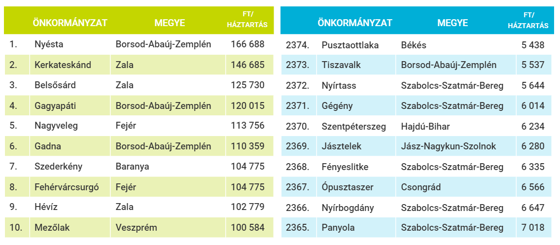 Tíz legtöbbet adó és a tíz legkevesebbet adó önkormányzat