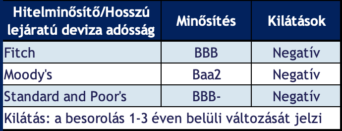 Lefordítva: a Moody’s esetében a Baa1 a befektetésre ajánlott kategória alsó középső szintje, ami jobb, mint a jelenlegi besorolásunk ennél az intézetnél. Az S&P esetében a besorolás ugyanolyan volt, mint most, azaz a „befektetésre ajánlott” kategória legalsó fokozata, negatív kilátással. A Fitchnél pedig ugyanúgy, mint jelenleg, egy fokozattal jobb, mint a befektetésre ajánlott kategória legalsó foka, szintén negatív kilátással.