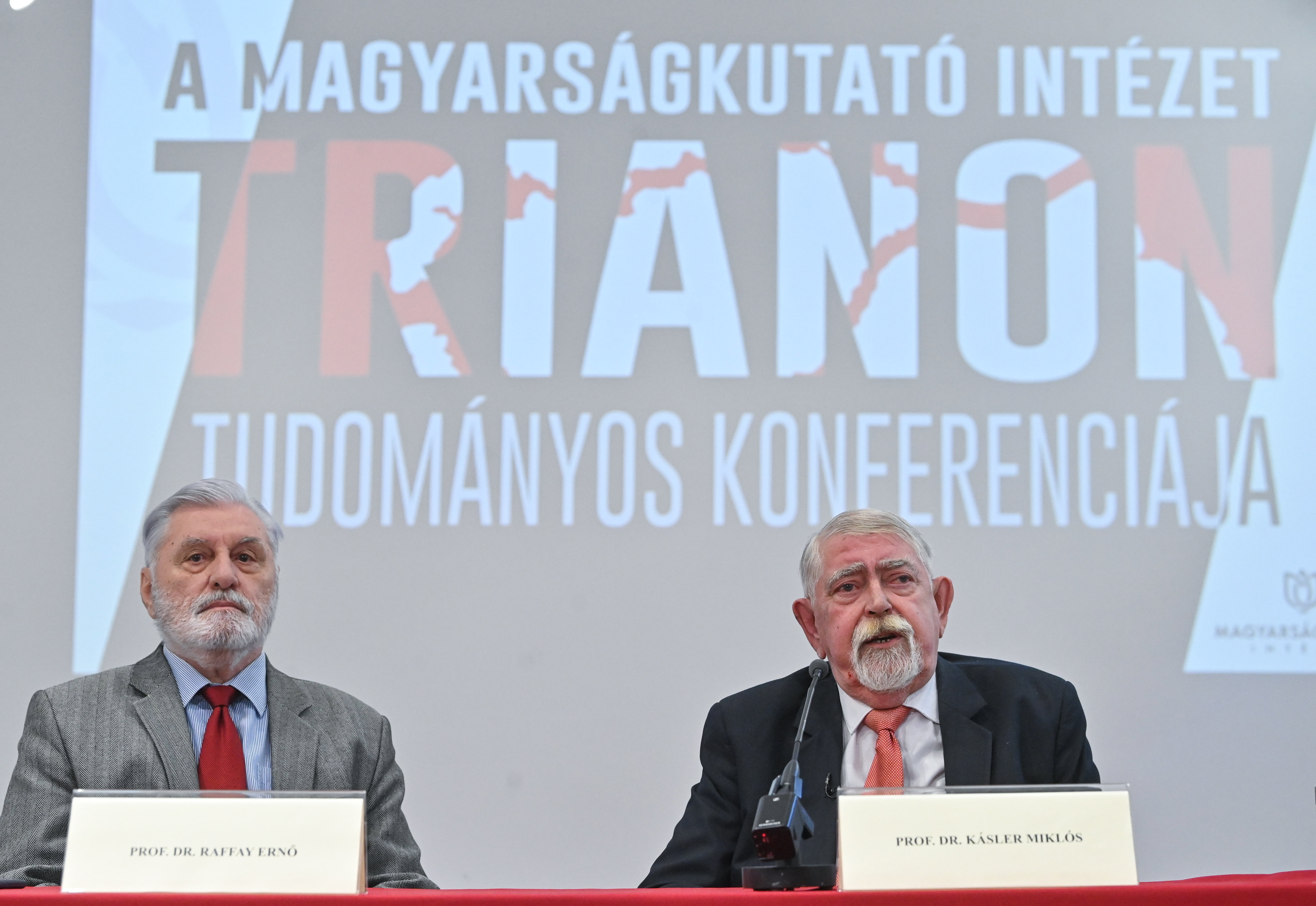 Kásler Miklós, a Magyarságkutató Intézet (MKI) főigazgatója (j) beszédet mond az intézet által szervezett Trianon tudományos konferencia megnyitóján, mellette Raffay Ernő történész, az MKI Trianon kutatócsoportjának vezetője a Magyarságkutató Intézetben 2024. január 29-én. MTI/Bruzák Noémi