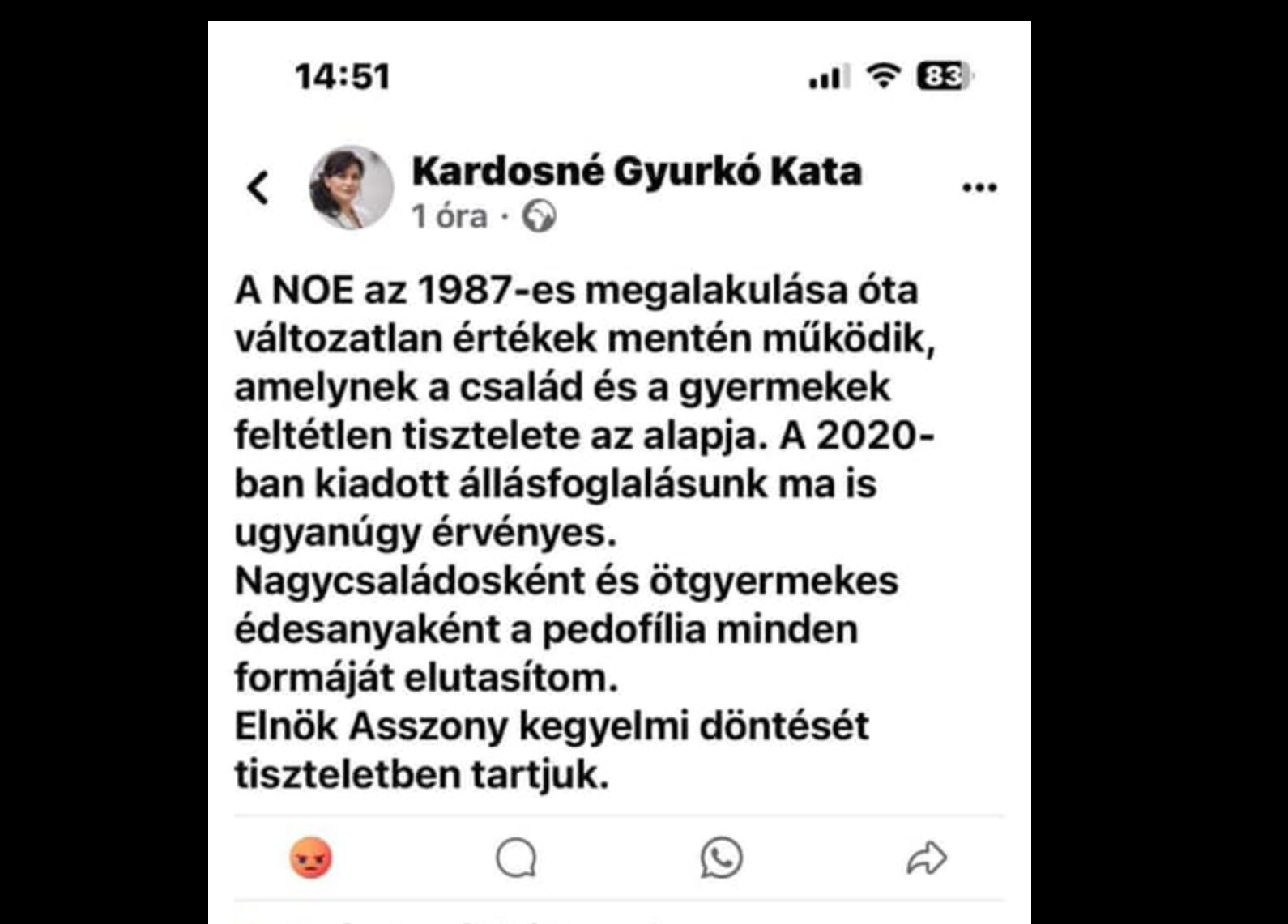 „A NOE az 1987-es megalakulása óta változatlan értékek mentén működik, amelynek a család és a gyermekek feltétlen tisztelete az alapja. A 2020-ban kiadott állásfoglalásunk ma is ugyanúgy érvényes. Nagycsaládosként és ötgyermekes édesanyaként a pedofília minden formáját elutasítom. Elnök Asszony kegyelmi döntését tiszteletben tartjuk” – írta az eredeti posztban, majd nem sokkal később törölte az utolsó mondatot.