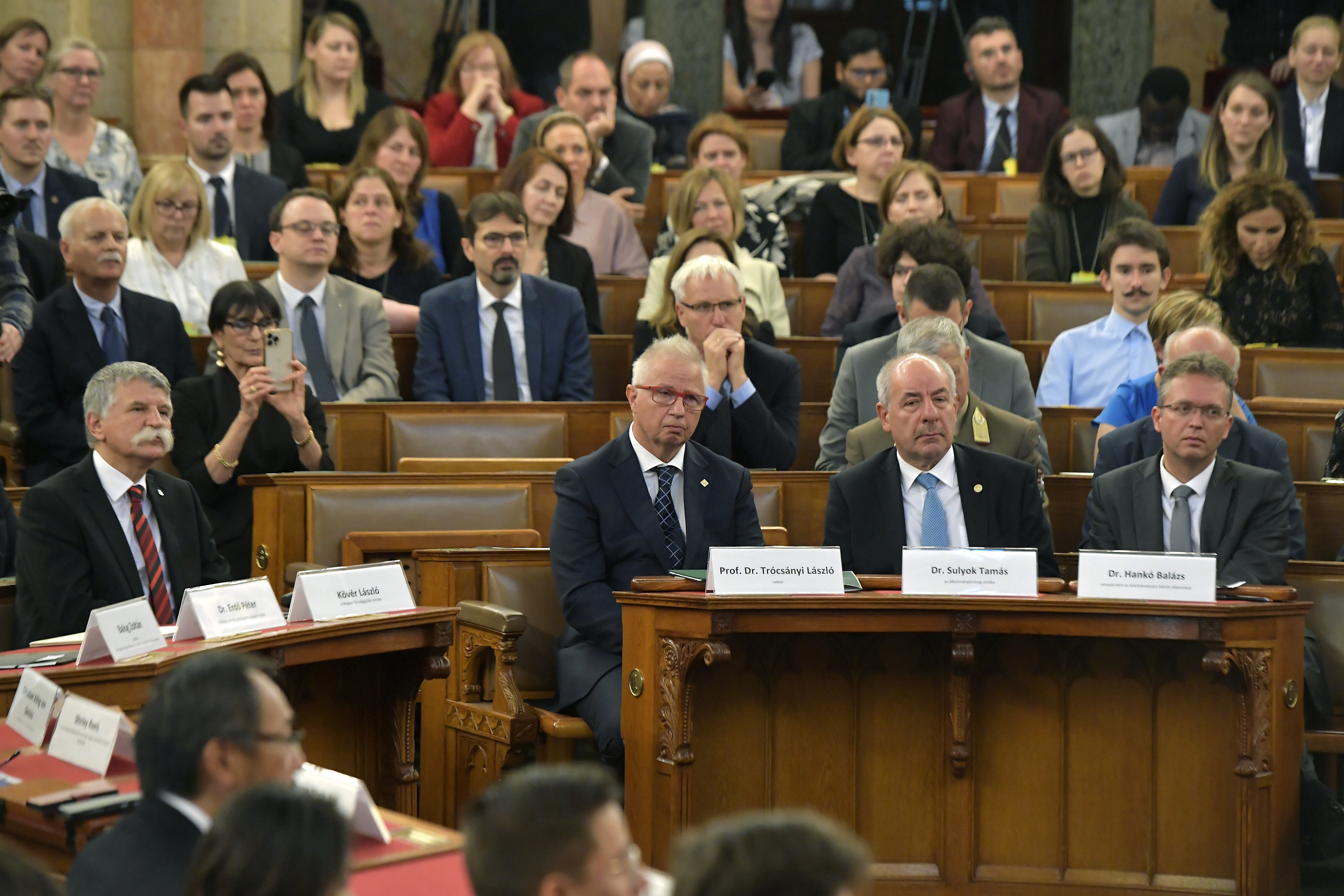 Kövér László, az Országgyűlés elnöke, mellette Trócsányi László, a Magyar Jogász Egylet elnöke, a Károli Gáspár Református Egyetem rektora, a Fidesz európai parlamenti képviselője, Sulyok Tamás, az Alkotmánybíróság elnöke és Hankó Balázs, a Kulturális és Innovációs Minisztérium innovációért és felsőoktatásért felelős államtitkára a Károli Gáspár Református Egyetem alapításának 30. évfordulója alkalmából rendezett konferencián az Országház Felsőházi termében 2023. október 12-én. MTI/Soós Lajos