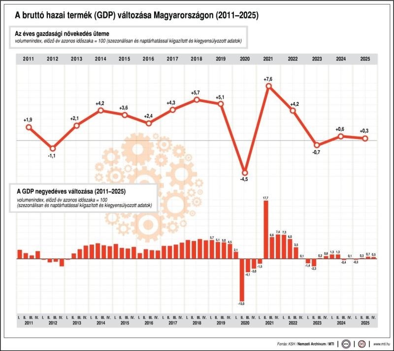 Magyarország bruttó hazai termékének volumene 2025 negyedik negyedévében a nyers adatok szerint 0,7, a szezonálisan és naptárhatással kiigazított és kiegyensúlyozott adatok szerint 0,5 százalékkal felülmúlta az előző évi azonos időszakit – jelentette pénteken első becslése alapján a Központi Statisztikai Hivatal (KSH).