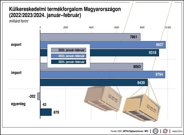2024. februárban a kivitel volumene 3,4 százalékkal haladta meg, a behozatalé 4,7 százalékkal elmaradt az előző év azonos időszakitól. Az aktívum 1,7 milliárd euró volt, az egyenleg 1,2 milliárd euróval javult az egy évvel korábbihoz képest – közölte csütörtökön kiadott második becslésében a Központi Statisztikai Hivatal (KSH).