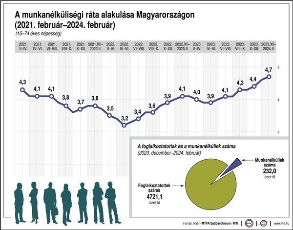 2023. december és 2024. február között a 15-74 éves munkanélküliek száma az előző évhez képest 33 ezerrel, 232 ezerre, míg a munkanélküliségi ráta 0,6 százalékponttal, 4,7 százalékra nőtt.