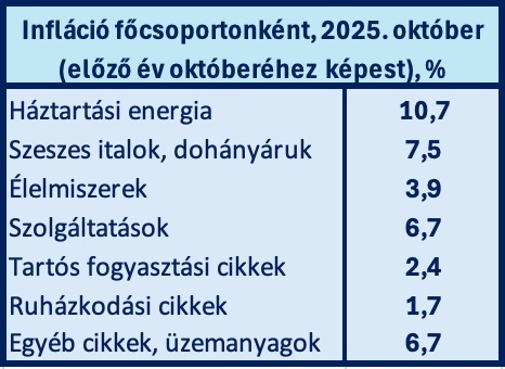 Ami a főcsoportokat illeti: az alábbi táblázatban látható adatok szerint a háztartási energia volt az átlagos inflációt a leginkább felfelé húzó tétel, az élelmiszerek csak az ötödik volt ebben a sorban. A tartós fogyasztási cikkek és a ruházkodási cikkek mellett az élelmiszerek árának növekedése lassult szeptemberhez képest.