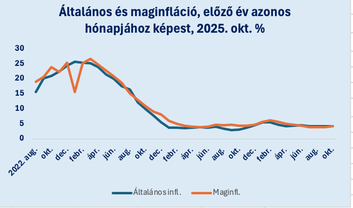 Az idén októberben a fogyasztói árak átlagosan 4,3 százalékkal haladták meg az egy évvel korábbiakat, szeptemberhez viszonyítva átlagosan nem változtak az árak – jelentette a KSH. Mint az alábbi grafikonból is látható, az átlagos infláció októberben hajszálra megegyezett a szeptemberivel, ugyanakkor a maginfláció meglódult felfelé, 0,3 százalékponttal haladva meg a szeptemberi értéket.