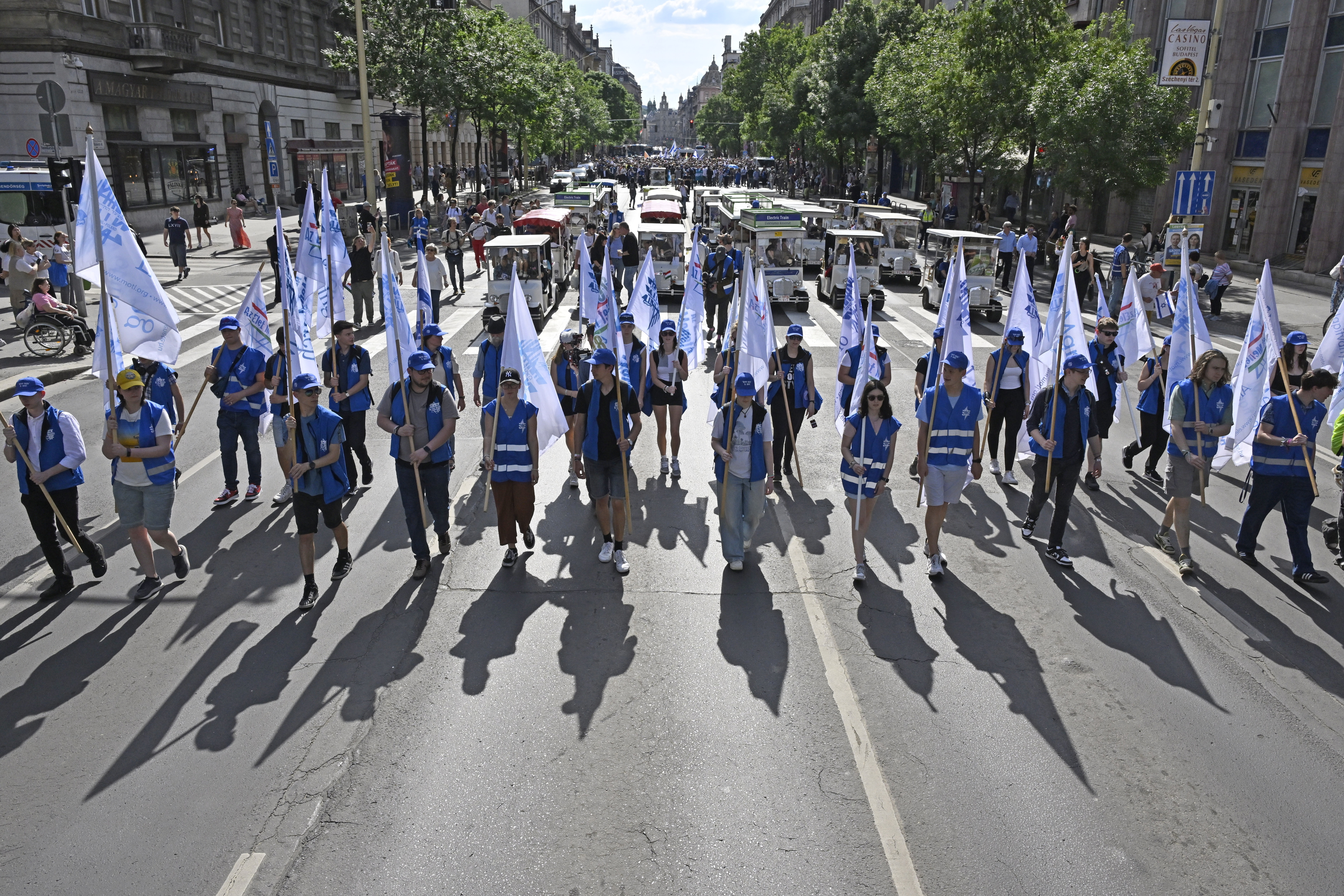 Az Élet menete rendezvény résztvevői a Rákóczi úton mennek a Kelet pályaudvarhoz 2024. május 5-én. MTI/Lakatos Péter