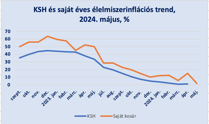 Ezt is szem előtt tartva, májusban mi óriási árzuhanást tapasztaltunk, összességében csak 2 százalékkal fizettünk többet, mint egy éve az ugyanazokat a tételeket tartalmazó kosarunk után. Miután a tapasztalatunk szerint a KSH és a saját élelmiszerinflációs számunk változásának trendvonala – egy-egy hónap kivételétől eltekintve – többé-kevésbé párhuzamosan fut, így kíváncsian a várjuk a soron következő hivatalos adatot.