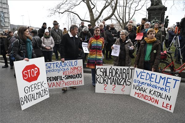 A demonstrálók az ellen tiltakoztak, hogy Novák Katalin államfő kegyelmet adott a bicskei gyermekotthon kényszerítés miatt elítélt volt igazgatóhelyettesének.