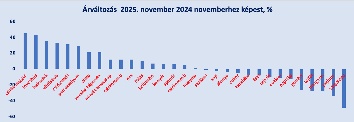 Nagyon érdekesen alakult az élelmiszerek árának változása novemberben. Az összkép nem annyira rossz: átlagosan 3,4 százalékos dinamikát mértünk a mi sajátos módszerünkkel (erről a cikk végén olvashatnak részletesen), ugyanakkor ez átlag, ami az utóbbi három és fél évben nem látott szóródással alakult ki. Ahogy az alábbi grafikon mutatja: volt olyan termék (nem is egy), amely 40 százalékot is meghaladó dinamikájú drágulást mutat, miközben a skála másik végén egy sor olyan termék található, amelynek az ára akár 49 százalékkal is csökkent. Így tételesen nézve, nem éppen kiegyensúlyozott az árak alakulása. Az is jellemző egyébként, hogy sok alapvető élelmiszer ára mérséklődött az elmúlt évhez viszonyítva, aminek az elsődleges oka az állam élelmiszerárrés-stopja – ennek azonban meglesz a komoly böjtje. Mihelyst ugyanis megszűnik a kormányzati beavatkozás az árakba (amit mi a választások utánra prognosztizálunk, függetlenül attól, ki alakíthat majd kormányt), rögvest meg fognak drágulni ezek a termékek.