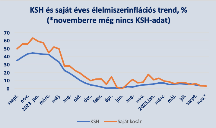 Szokásunkhoz híven, azt is megnéztük, hogyan alakul a trend, és ezt összevetettük a KSH hivatalos adatainak trendjével. Nos, miközben régóta hangoztatjuk, hogy a két vonal nagyjából együtt mozog, egy irányba feltétlenül, bár néha vannak kisebb-nagyobb eltérések. Mindenesetre azóta, hogy mi hónapról-hónapra vezetjük a saját bevásárlókosarunkba kerülő termékek árának az alakulását (ez pontosan 2022. szeptembere), most először fordult elő, hogy hajszálra megegyezik a két adat.