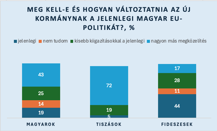 Amikor arról kérdezték a magyarokat, hogy milyen külpolitikát látnának szívesebben a következő kormánynál, a Tisza-párti szavazók 77 százaléka egyértelműen az európai partnerekkel való szorosabb együttműködés mellett tette le a voksát. A Fidesz-szavazók megosztottak voltak: egynegyedük szerint egyensúlyozni kellene a Nyugat, Oroszország és Kína között; csaknem ugyanennyi, 24 százalék a szorosabb együttműködést választaná Trump Amerikájával és csak 16 mondja, hogy az európai opció a legjobb Magyarország számára.
