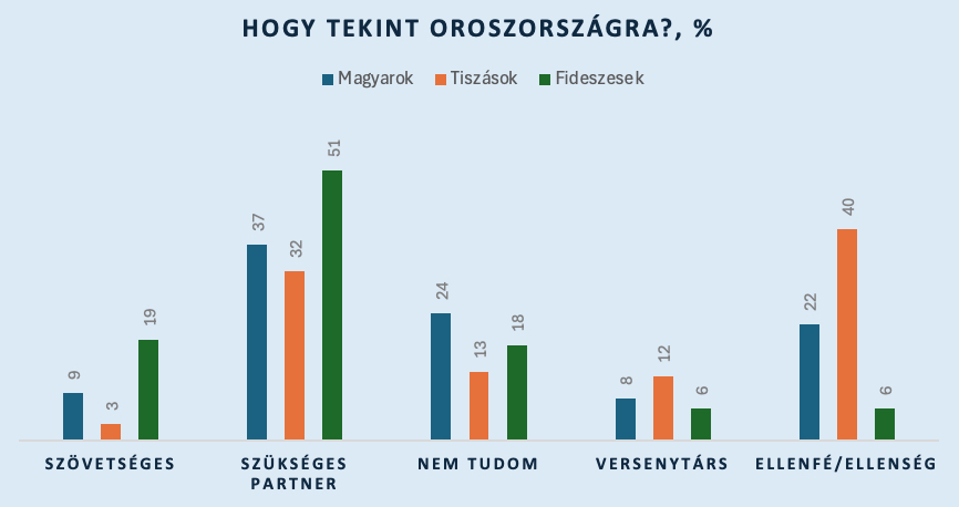 Legfeljebb csak szépségtapaszt jelenthet Orbán számára az, ahogyan ma a magyarok viszonyulnak Oroszországhoz. Igaz, e felmérés idején még nem voltak nyilvánosak azok a telefonbeszélgetések, amelyeket Szijjártó Péter külgazdasági és külügyminiszter folytatott Szergej Lavrovval, az orosz diplomácia vezetőjével (ezekről itt és itt olvashatnak), s még nem szivárgott ki az a jegyzőkönyv, amely Orbán Viktor (saját megfogalmazása szerint a kisegér) és a Kreml mindenható ura, Vlagyimir Putyin (Orbán szerint az oroszlán) tárgyalásáról született. Ezek ugyanis feketén-fehéren megmutatták: messze nem egyenrangú a diplomáciai kapcsolat a két ország vezetői között, ez egy alá-fölérendeltségi viszony, egyes megfogalmazások szerint az áruló és a tartótisztje közötti kapcsolat. Nos, habár Oroszország nem vált a magyarok kedvencévé, az orbáni hozzáállás azért meglehetősen érdekes eredményt hozott, elsősorban a Fidesz szavazói körében. Ami – jegyezzük meg – annál is meglepőbb, mivel Orbán híveinek a többsége a hatvan-hetven éven felüliek közül kerül ki, azaz abból a korosztályból, amelynek a tagjai éles oroszellenes érzelmeket tápláltak (már csak az 1956-os forradalom katonai leverése és az azt követő pár évnyi elnyomás miatt).