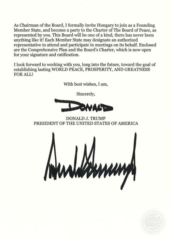 „Ez a tanács egyedülálló lesz, ilyen még soha nem volt!" – írja Donald Trump. A levél szerint minden tagállam maga döntheti el, hogy ki képviselje a testület ülésein. Az elnök azt írta, a levélhez csatolta 20 pontos béketervét és a Béketanács chartáját is.