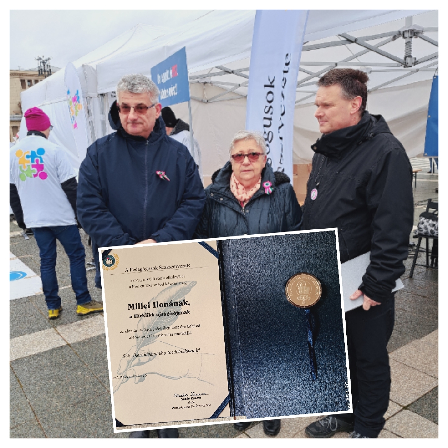 Ha már a Pedagógusok Szakszervezeténél tartunk, a sajtónap alkalmából két újságíró is kitüntetést kapott az érdekvédelmi szervezettől: az oktatás javítása érdekében tett erőfeszítéseiért Juhász Dániel, a Népszava, és Millei Ilona, a Hírklikk újságírója részesült az elismerésben. (Lapunk munkatársának ezúton is gratulálunk, a képen a PSZ két alelnökével látható – a szerk.)