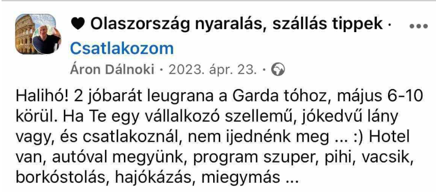 „Két jó barát leugrana a Garda tóra, Budapestről, ha te vállalkozó szellemű, jókedvű lány vagy, és csatlakoznál, nem ijednénk meg”