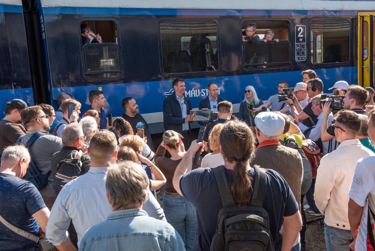 Vitézy Dávid délután civilekkel együtt különvonattal utazott Dombóvárról a mecseki városba a két település közötti, 2023 nyarán bezárt vasútvonallal kapcsolatos emlékmenet keretében.