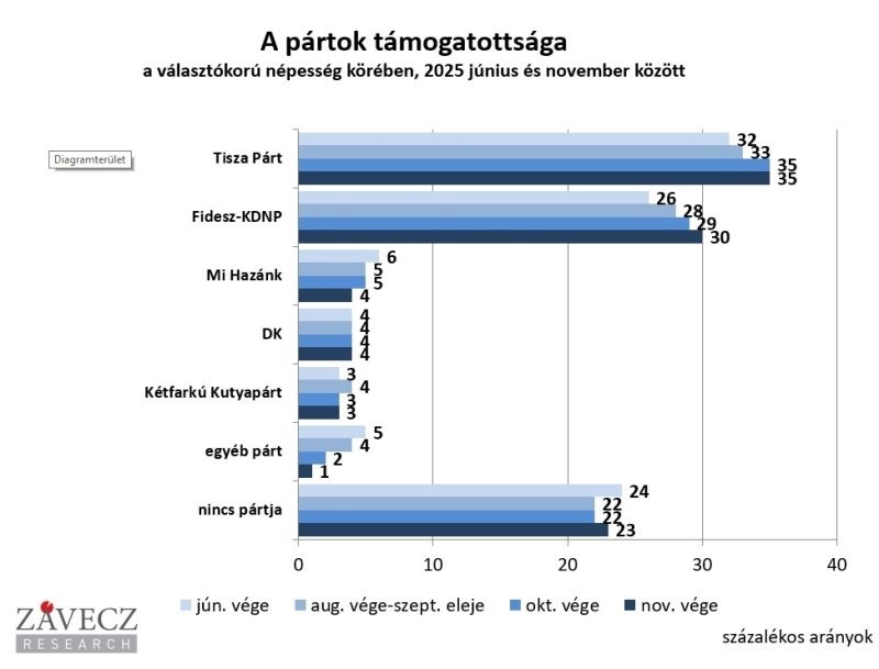 Az elmúlt egy hónapban nem változott a Tisza Párt támogatottsága a teljes népességben: továbbra is 35 százalékon áll, míg a Fidesznek egy hajszállal, 29-ről 30 százalékra bővült a tábora a ZRI Závecz Research Intézet november végén végzett közvélemény-kutatása szerint.
