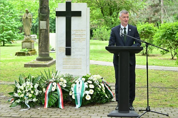 Kubatov Gábor beszédet mond az FTC alapításának 125. évfordulója alkalmából a Fiumei úti sírkertben tartott megemlékezésen, Springer Ferenc, a klub első elnöke síremlékénél - MTI/Purger Tamás